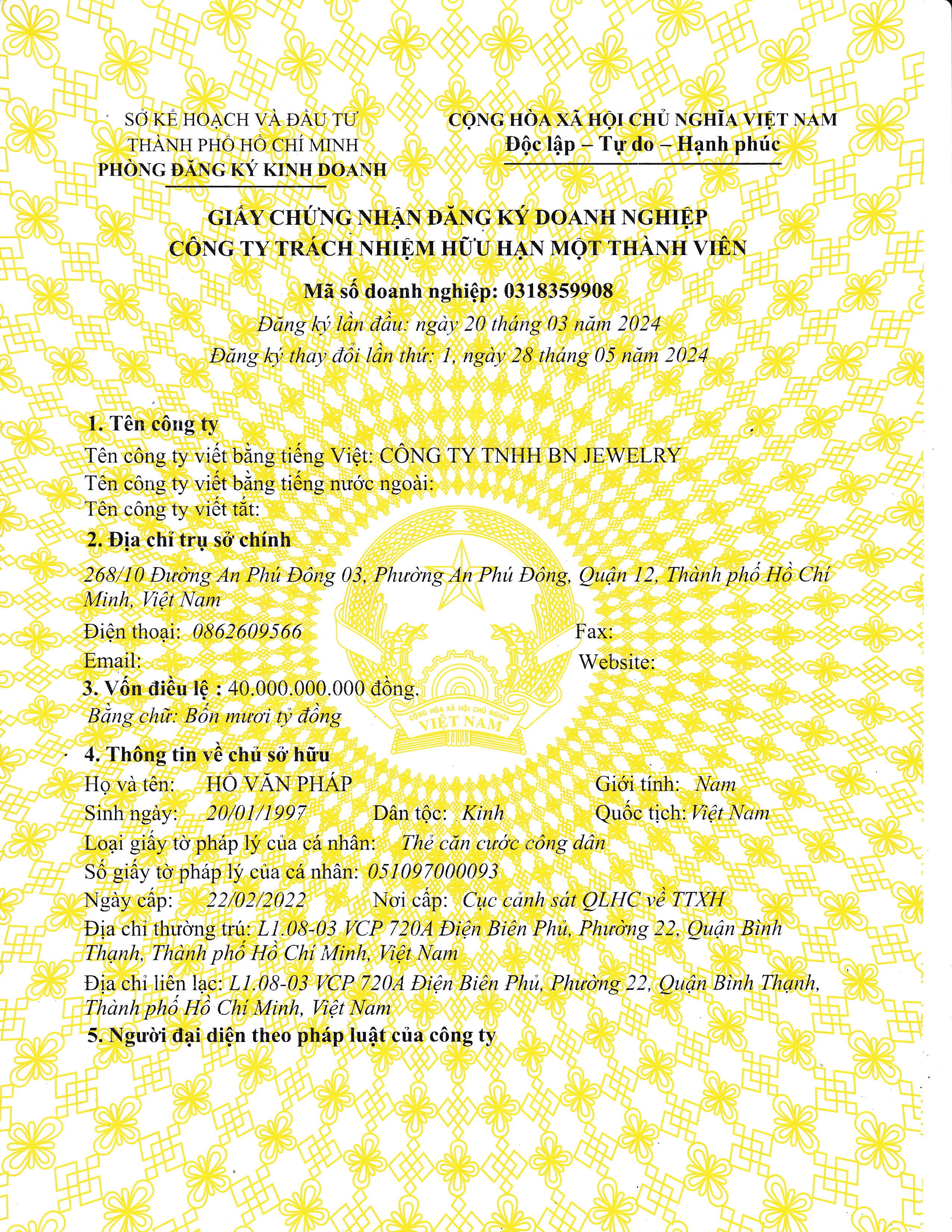 Giấy chứng nhận đăng ký kinh doanh này xác nhận Công ty TNHH BN JEWELRY được thành lập và hoạt động hợp pháp theo quy định của pháp luật Việt Nam.